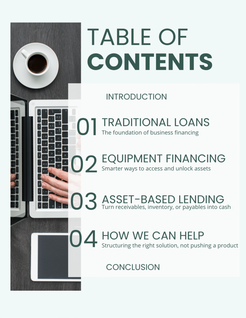 - Asset‑Based Lending: turn receivables, inventory, and payables into cash flow.